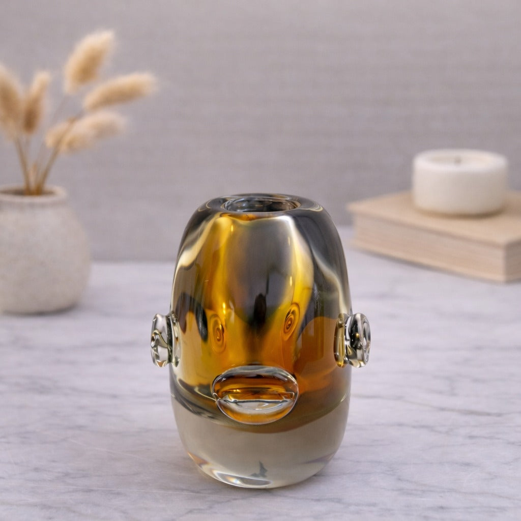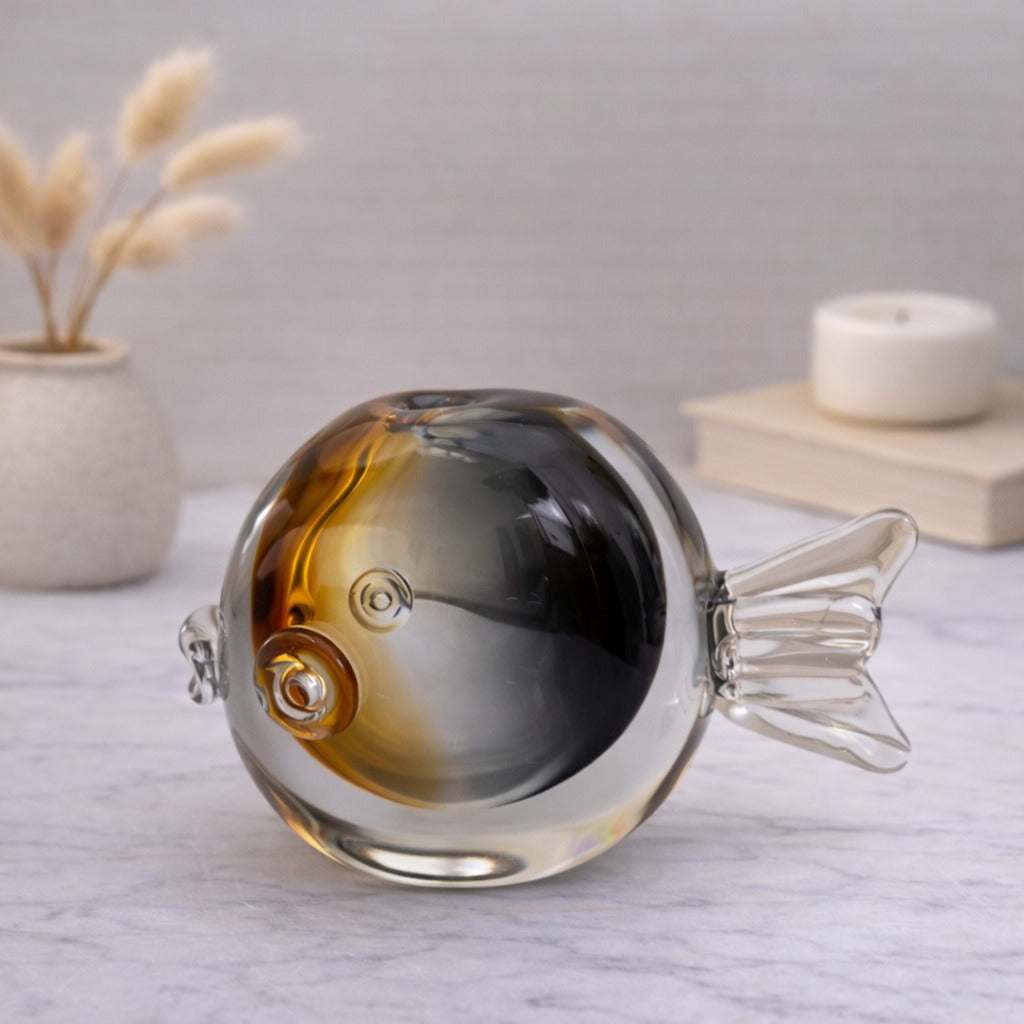 Amber & Black Crystal Fish Figurine – A beautifully hand-crafted Crystal sculpture with a smooth blend of amber, black, and clear tones, shaped into an elegant fish design. Perfect as a unique decorative accent or collectible art piece.