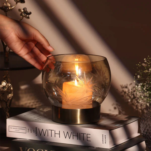 Crafted to beautifully enhance candlelight, the tinted glass hurricane creates a gentle, glowing ambience that instantly elevates your interiors. Whether styled alone or paired with floral décor, candles, or seasonal accents, the Lotus Hurricane brings depth, elegance, and visual charm to your home.